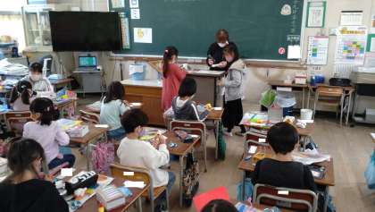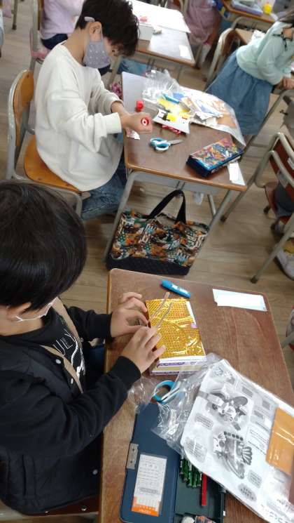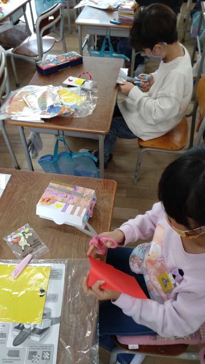 立体作品づくりに取り組みました。紙の箱を飾って楽しく変身させる「うきうきボックス」を作っています。