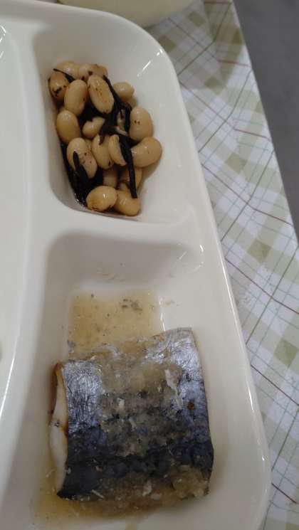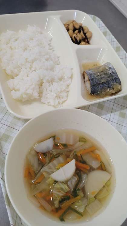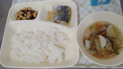 今日の給食は、さごしのおろしじょうゆかけ、さといものすまし汁、大豆の煮もの、ごはん、牛乳です。