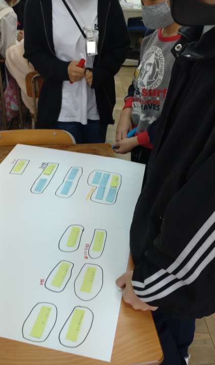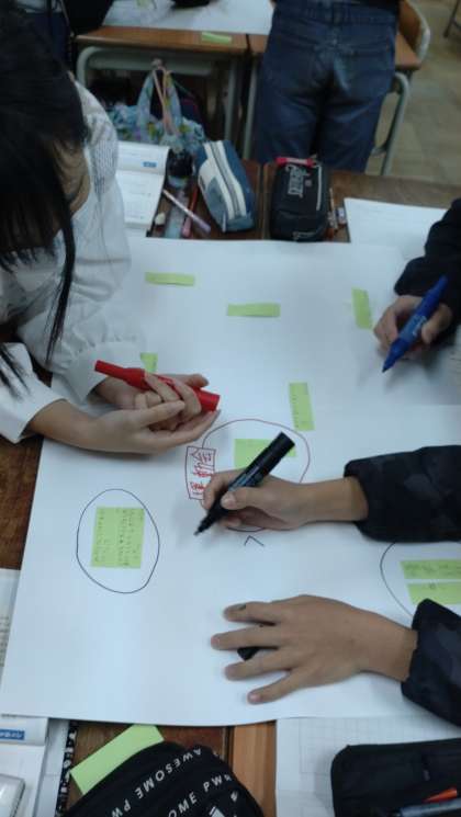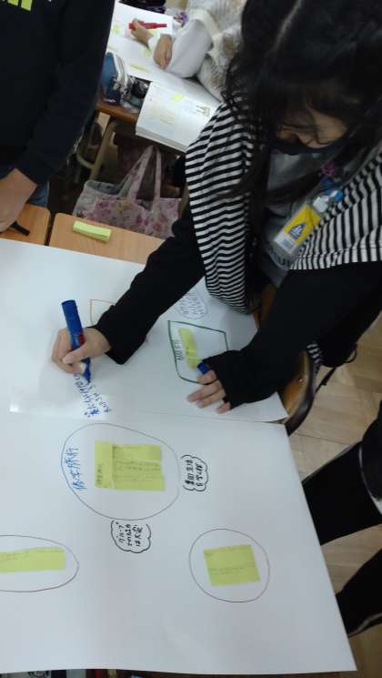 個々で考えた卒業文集のテーマを集め、グループで付箋紙を使ってカテゴリー分けをしています。それぞれのテーマについて意見を交流しています。