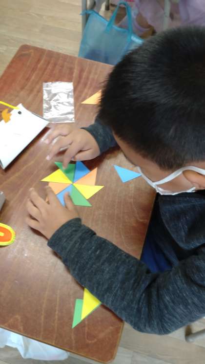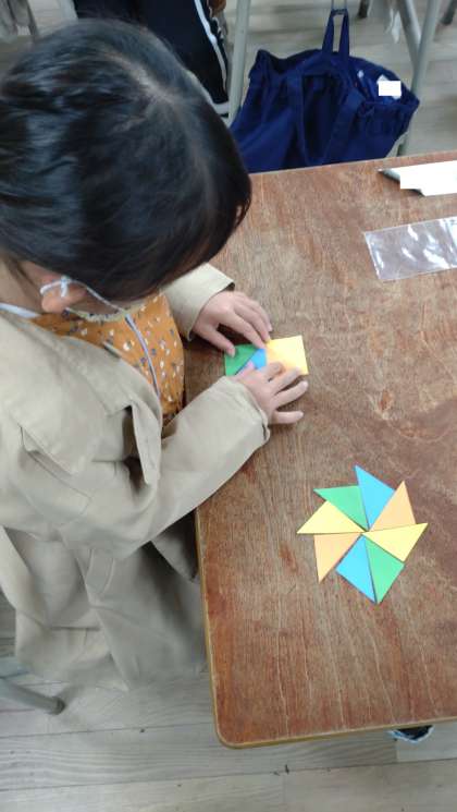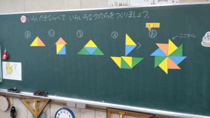 三角形をいろいろとならべて、形をつくりました。ものの形の特徴をとらえて色板を使って形を構成したり分解したりする学習です。
