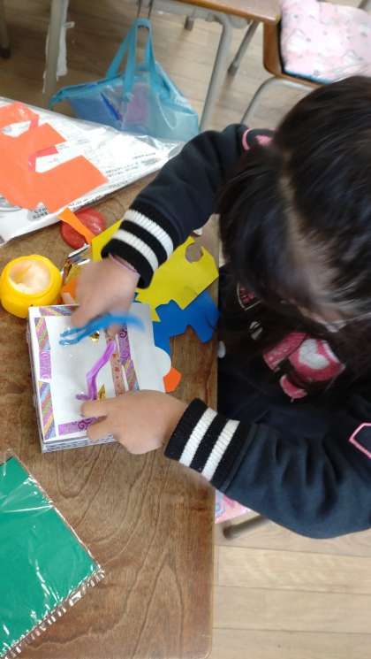 「うきうきボックス」の作品づくり取り組みました。箱の色や形をいかした飾り付けをしています。