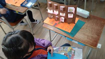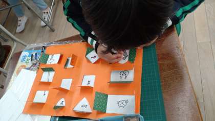 題材「まどからこんにちは」の作品づくりに取り組みました。カッターを上手に使って窓を開けています。一つ一つまどから人や動物など、想像の世界が広がっています。