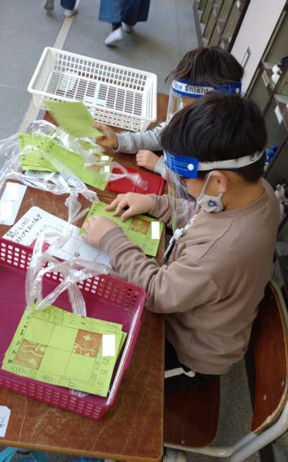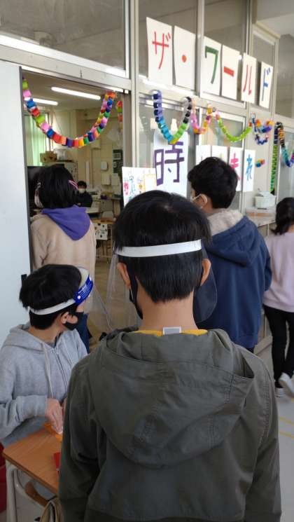 お店を行くとスタンプカードにスタンプを押してもらいます。受付係の子どもたちも大忙しです。お店の子どもたちはフェイスガードをしてお客さんの対応をしています。