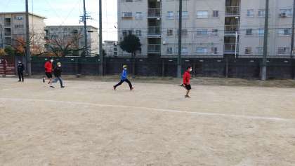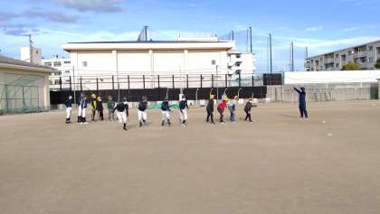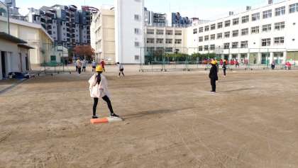 中学校の運動場でも、部活動体験をしています。写真は上から、陸上部、野球部、ソフトボール部の体験活動の様子です。