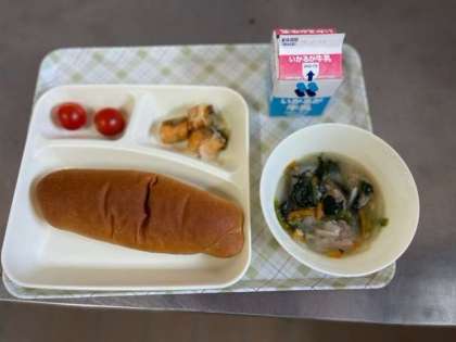 今日の給食は、さけのマリネ、肉だんごと麦のスープ、プチトマト、パン、牛乳です。