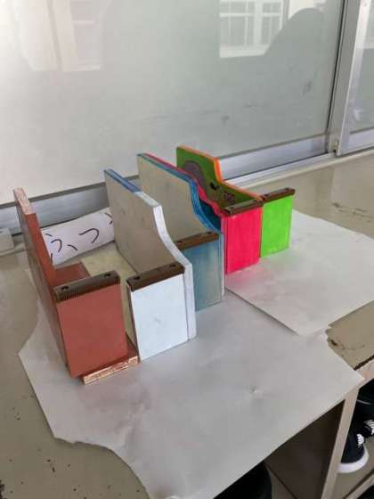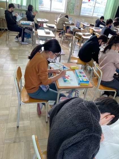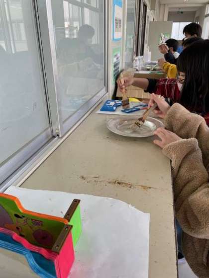 図画工作で「テープカッター」を作っています。仕上げにニスを塗ります。