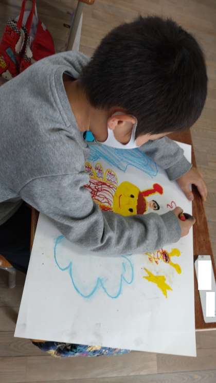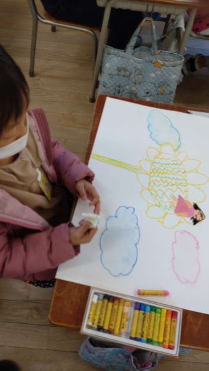 「のってみたいな いきたいな」の作品づくりをしました。生き物の乗り物を完成させて、乗っている自分を描画しています。