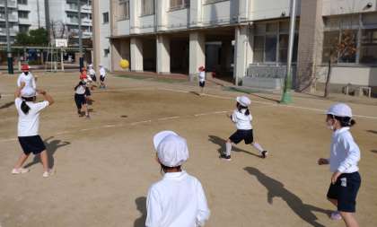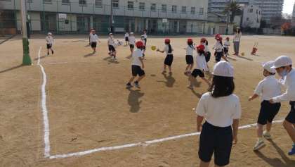 ドッジボールをしました。楽しくゲームをしています。結果発表では、チームでとても喜んでいました。