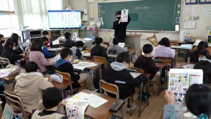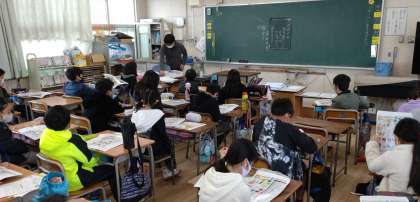 彫刻刀セットの説明を聞いています。お家にある場合も、彫刻刀の種類や本数などの確認をお願いします。