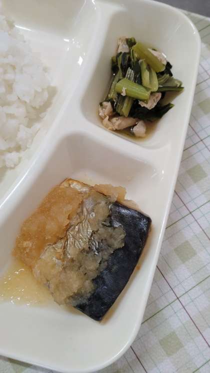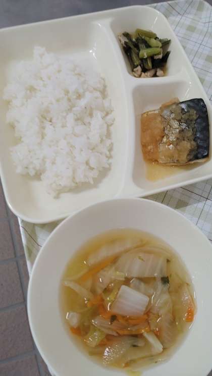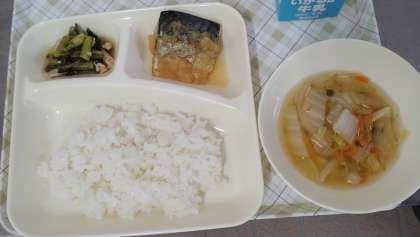 今日の給食は、さばのみぞれかけ、すまし汁、こまつなの煮びたし、ごはん、牛乳です。