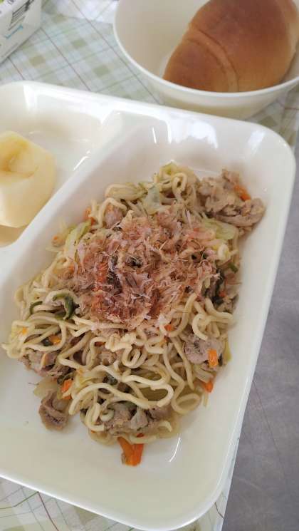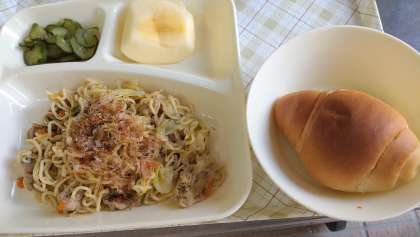 今日の給食は、和風やきそば、きゅうりのしょうがづけ、りんご、パン、牛乳です。