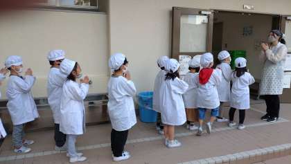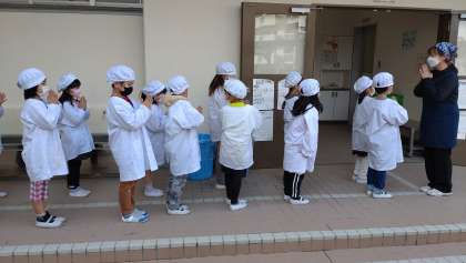 給食室の前で、「いただきます!」と感謝の挨拶をしています。写真は、しっかりと挨拶している1年生の様子です。