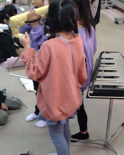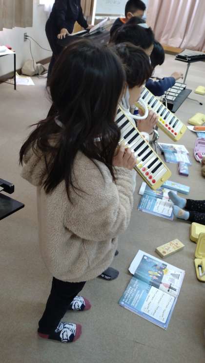 音楽室で合奏をしました。鍵盤ハーモニカや鉄琴、トライアングルなどで、「きらきらぼし」を合奏しています。