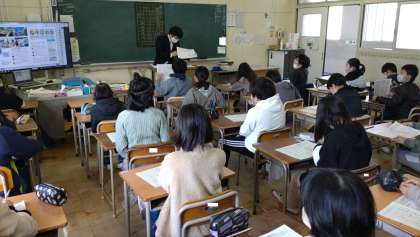 写真は、5年生の学級の様子です。子どもたちは、冬休みの生活について、担任の先生からのお話を真剣に聴いています。