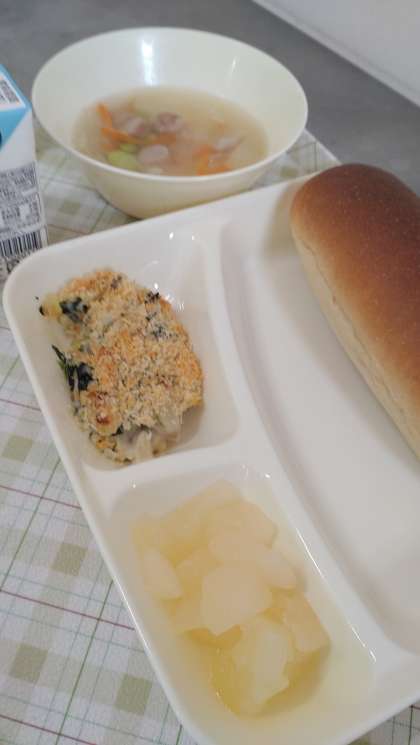 今日の給食は、マカロニグラタン、ウインナーのスープ、和なし、パン、牛乳です。