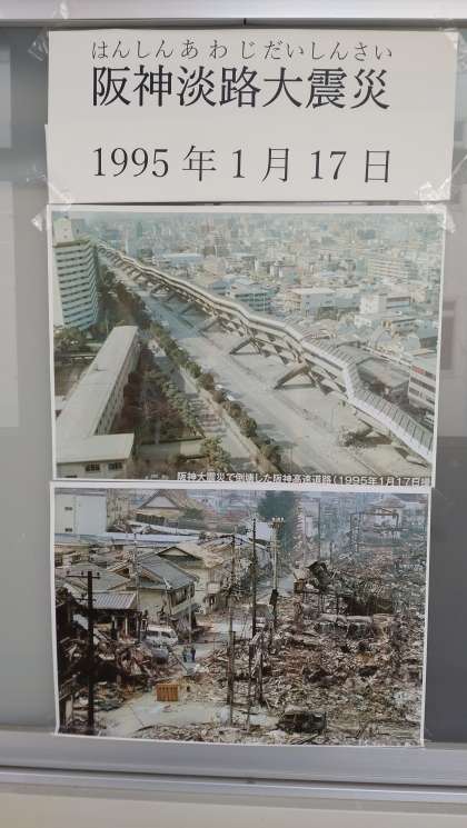 27年前の1月17日、阪神淡路大震災が起こりました。今朝の放送による児童朝会で、阪神淡路大震災の様子や防災に対する心構えについての校長講話がありました。写真は、校長室前の阪神淡路大震災の掲示です。