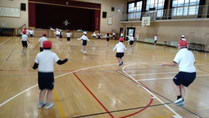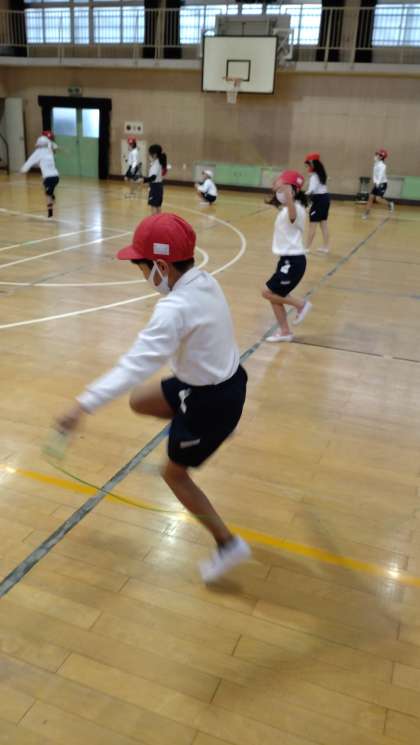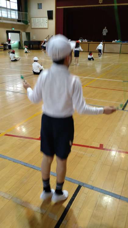 なわとひ運動に取り組んでいます。なわとびは、跳躍を主とした全身運動で、手足の調整力、巧緻性、敏捷性、持久力などを高めます。子どもたちは、とても熱心にリズムよく跳んでいます。
