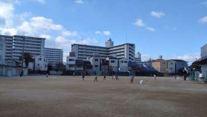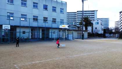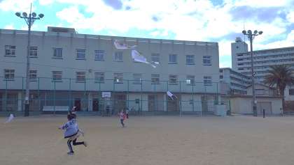 凧あげをしました。子どもたちは運動場を走って凧をあげています。とても楽しそうです。