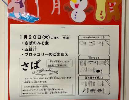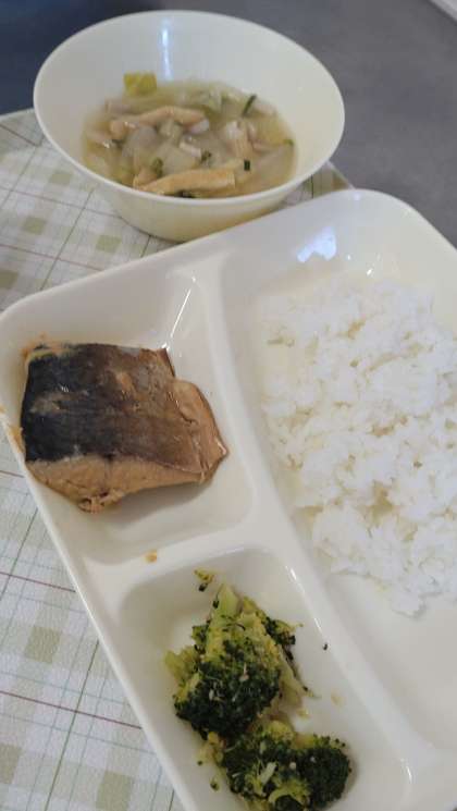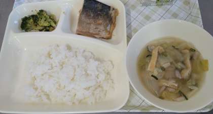 今日の給食は、さばのみそ煮、五目汁、ブロッコリーのごまあえ、ごはん、牛乳です。