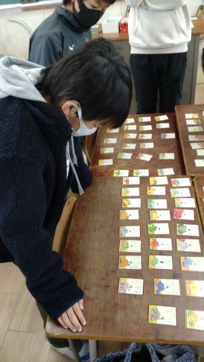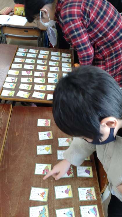百人一首に取り組みました。まず教科書に紹介されている短歌を絵札で覚えています。