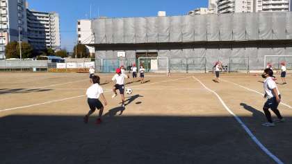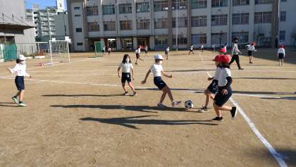 ゴール型ゲームのサッカーに取り組みました。声を掛け合うなどチームで協力して、ゲームを楽しんでいます。
