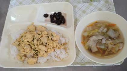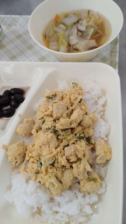 今日の給食は、親子丼、すまし汁、黒豆の煮もの、牛乳です。