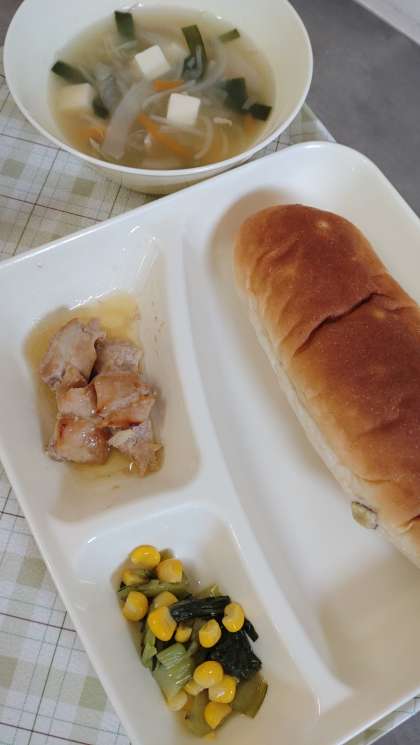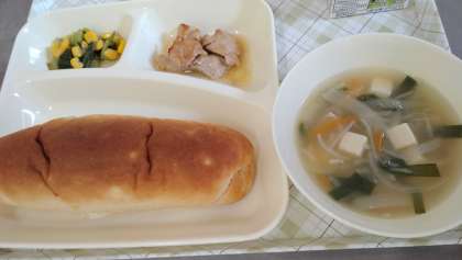 今日の給食は、鶏肉のオイスターソース焼き、ワンタンの皮ととうふのスープ、チンゲンサイとコーンの中華あえ、パン、牛乳です。