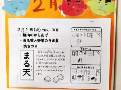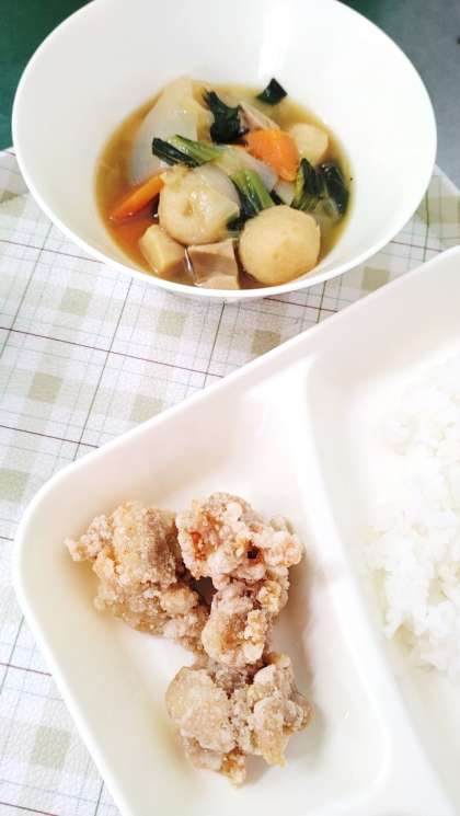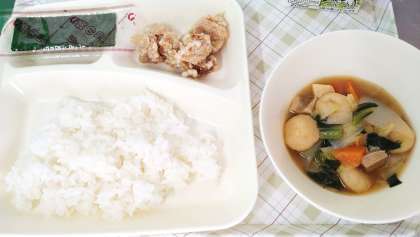 今日の給食は、鶏肉のからあげ、まる天と野菜のうま煮、焼きのり、ごはん、牛乳です。