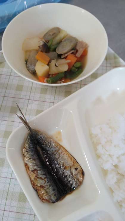 今日の給食は、いわしのしょうゆがけ、含め煮、いり大豆、ごはん、牛乳です。
