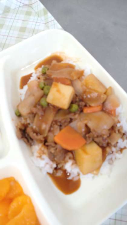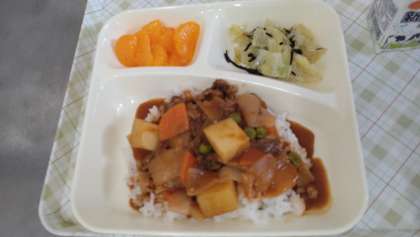 今日の給食は、ハヤシライス、キャベツのひじきドレッシング、みかん、牛乳です。