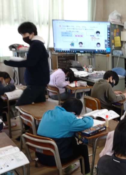 「変わり方」の学習をしました。正方形を並べた階だんの形から、だんの数と周りの長さの関係を学んでいます。