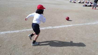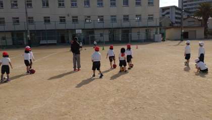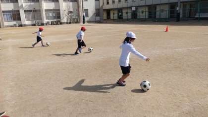 ボールけりゲームをしました。コーンをまわって、チームの友だちにリレー形式でつないでいきます。