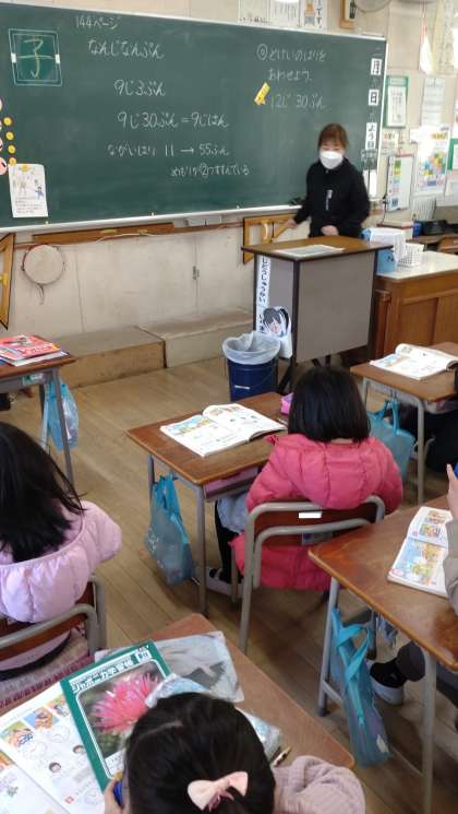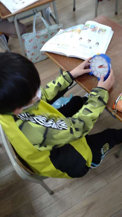 何時何分の時刻の読み方を学習しました。模型時計を使って、表された時刻を読んだり、指示された時刻を表したりしています。