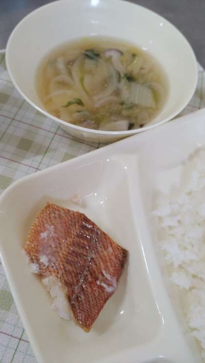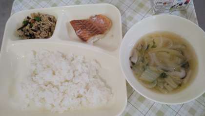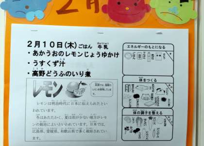 今日の給食は、あかうおのレモンじょうゆかけ、うすくず汁、高野どうふのいり煮、ごはん、牛乳です。