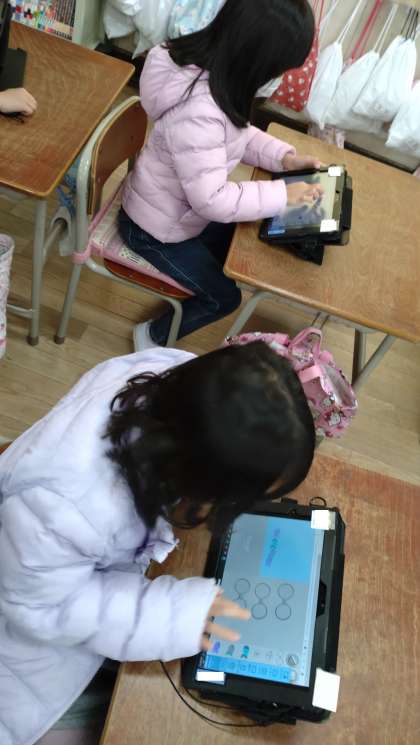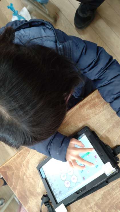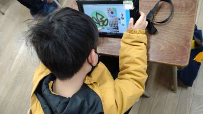 ビジュアルプログラミング言語ソフトのプログラミングツールを使って、絵を動かすという命令をつくる仕組みを学んでいます。子どもたちは、いろいろと試行錯誤しながら、自分の思い通りに動かす方法をみつけていきます。