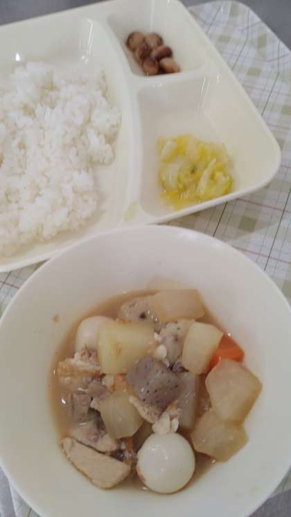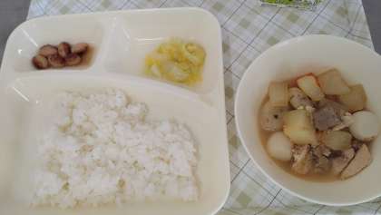 今日の給食は、関東煮、はくさいの甘酢あえ、とら豆煮もの、ごはん、牛乳です。