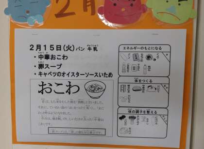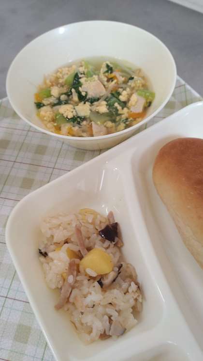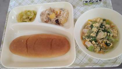今日の給食は、中華おこわ、卵スープ、キャベツのオイスターソースいため、パン、牛乳です。