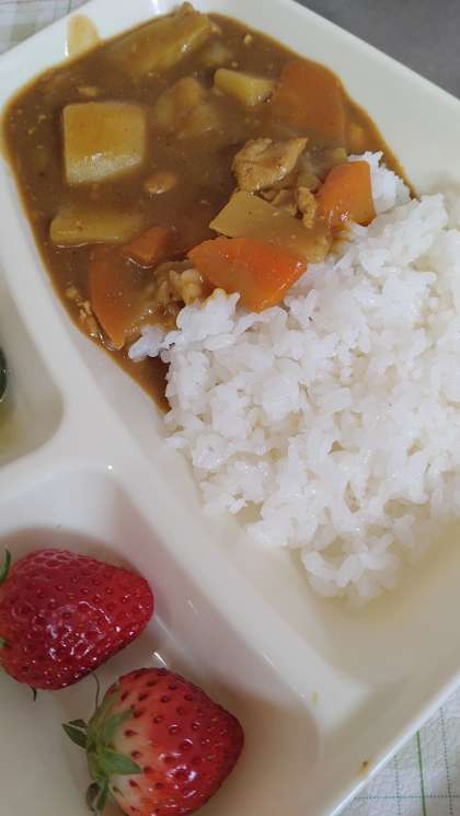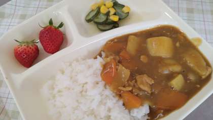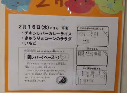 今日は、子どもたちにとって人気の高いカレーの給食です。給食のメニューは、チキンレバーカレー、きゅうりとコーンのサラダ、いちご、牛乳です。井高野小学校の2月の生活目標は、「健康に気をつけて過ごしましょう」です。健康は、栄養バランスのとれた食事によって支えられています。ご家庭でも、好き嫌いなくバランスのよい食事をとれるようにご協力をよろしくお願いします。
