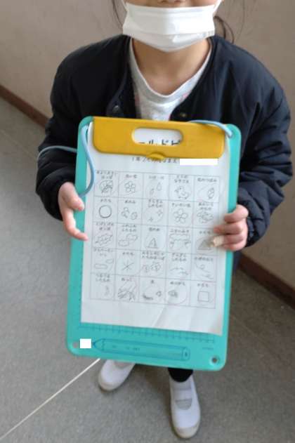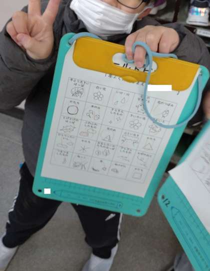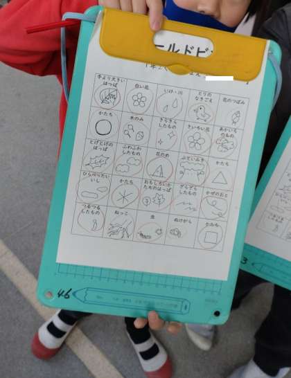 フィールドビンゴの活動をしました。学習園や運動場のフィールドで、手より大きい葉っぱや木の実、花のつぼみなどを見つけていく活動です。子どもたちは、とても嬉しそうににフィールドビンゴのシートを見せてくれました。