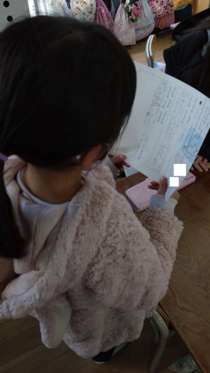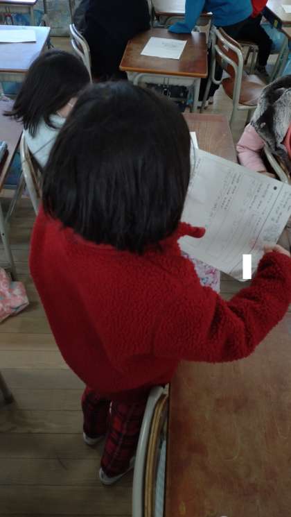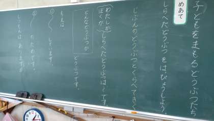 説明文「子どもをまもるどうぶつたち」の学習をしました。イルカや象など、子どもたちが興味をもって自分で調べた動物の知恵について発表しています。
