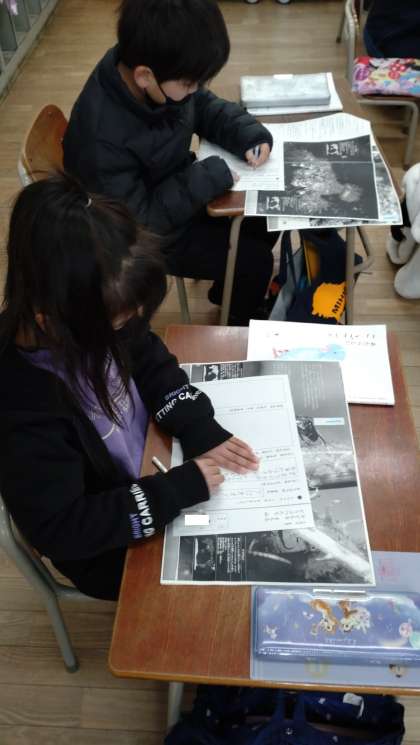 動物の知恵について調べました。どんな動物で、どんな知恵なのかなど、ワークシートにまとめています。
