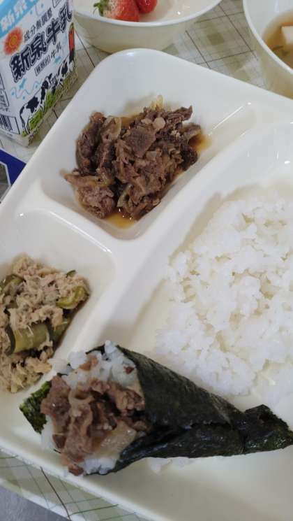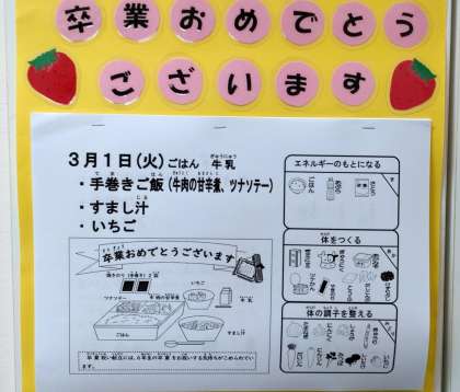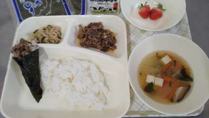 今日の給食は、卒業祝い献立で、手巻きご飯(牛肉の甘辛煮、ツナソテー)、すまし汁、いちご、牛乳です。6年生の卒業が近づいてきました。みんなでお祝いしたいですね。