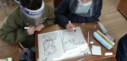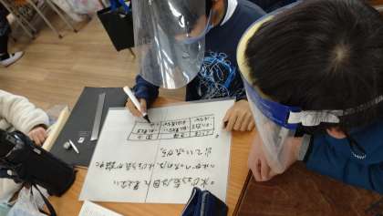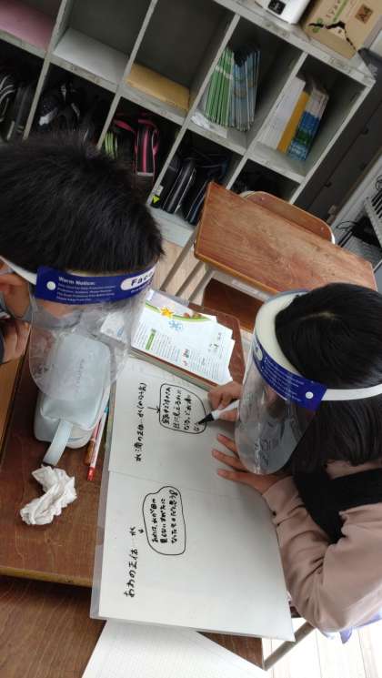 水を熱したときのあわの正体についてグループで話し合いました。実験結果から考察しています。