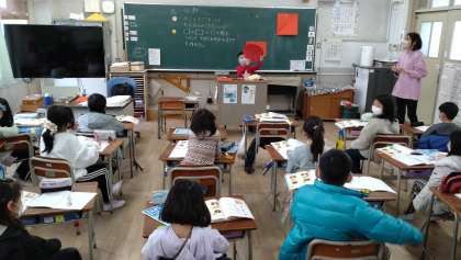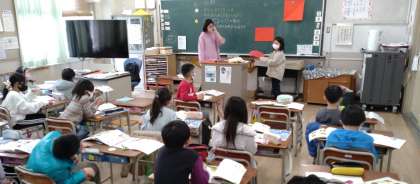 分数の学習をしました。□や〇の紙を使って、それぞれ半分の大きさをつくり、その表し方を発表しています。