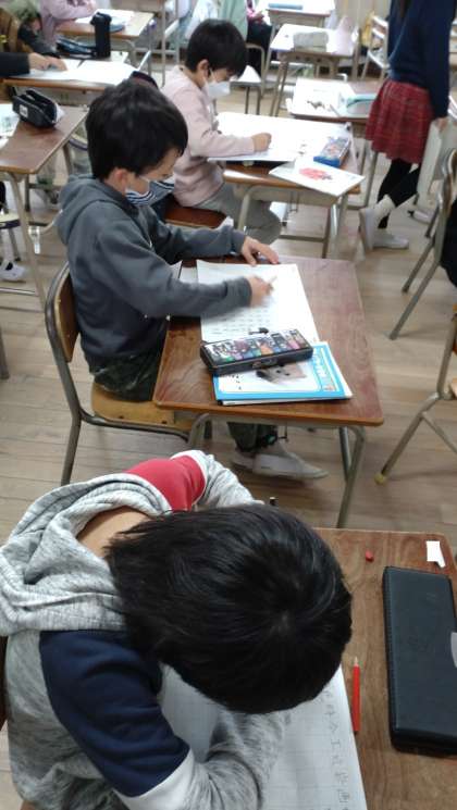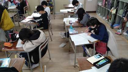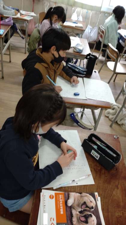 作文の学習をしました。下書きの作文を見ながら原稿用紙に丁寧に清書を書いています。