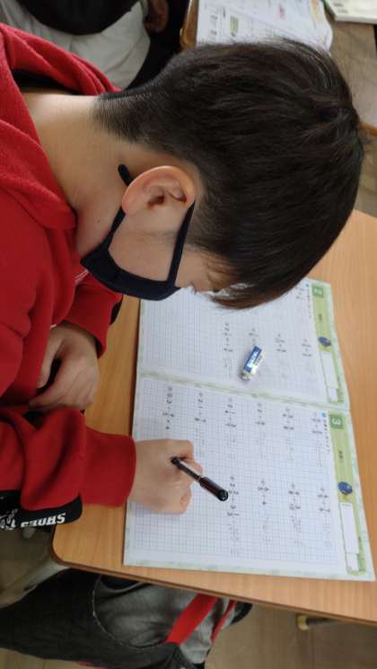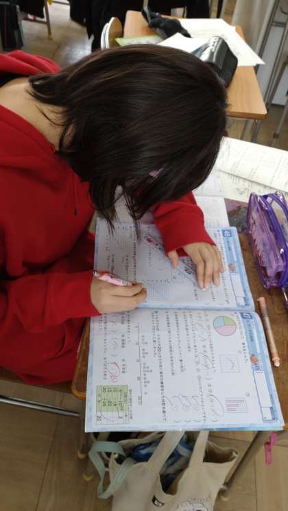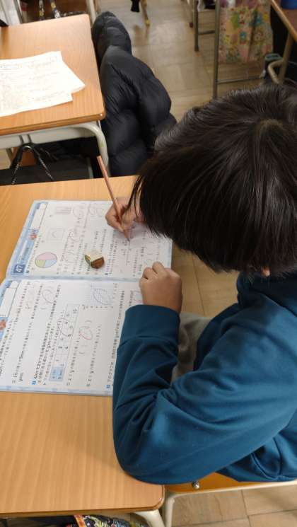 まとめの学習をしました。分数のわり算やデータの活用など6年生で学習した単元を振り返って復習しています。