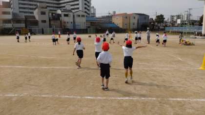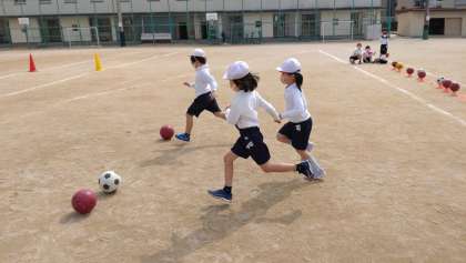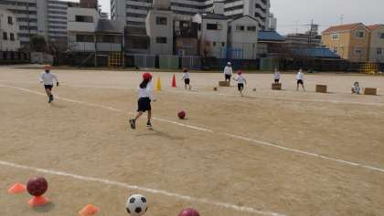 ボールけりゲームをしました。全力でボールをけっています。得点を数えたり得点発表したりと協力して子どもたちで取り組んでいます。