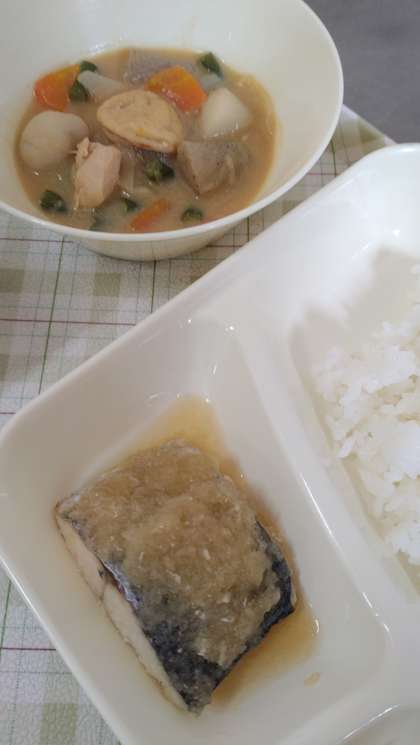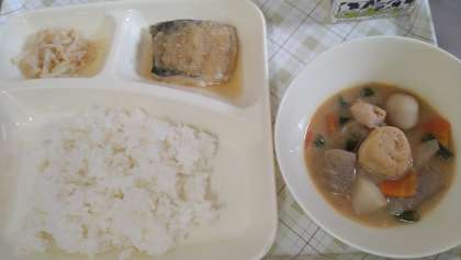今日の給食は、さごしのおろしじょうゆかけ、一口がんもとさといものみそ汁、もやしのゆずの香あえ、ごはん、牛乳です。