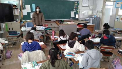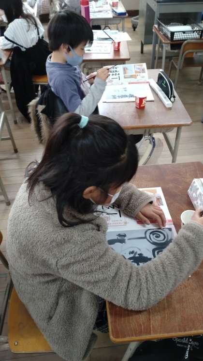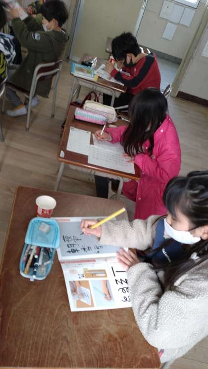 書写の教科書についている水書きシートに水書筆で文字やいろいろな線を書きました。3年生ではじまる毛筆の習字が楽しみですね。