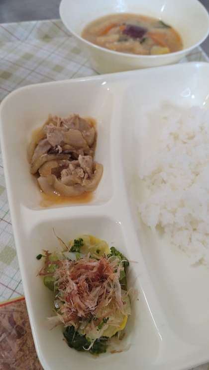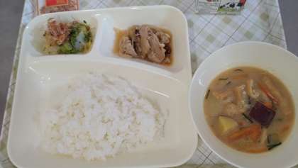 今日の給食は、豚肉のしょうが焼き、さつまいものみそ汁、なのはなのおひたし、ごはん、牛乳です。